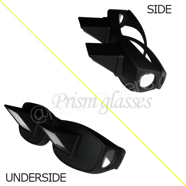 プリズムの反射により寝たままの姿勢で本を読んだり 仰向けのままTVが見たりできる便利なメガネです。